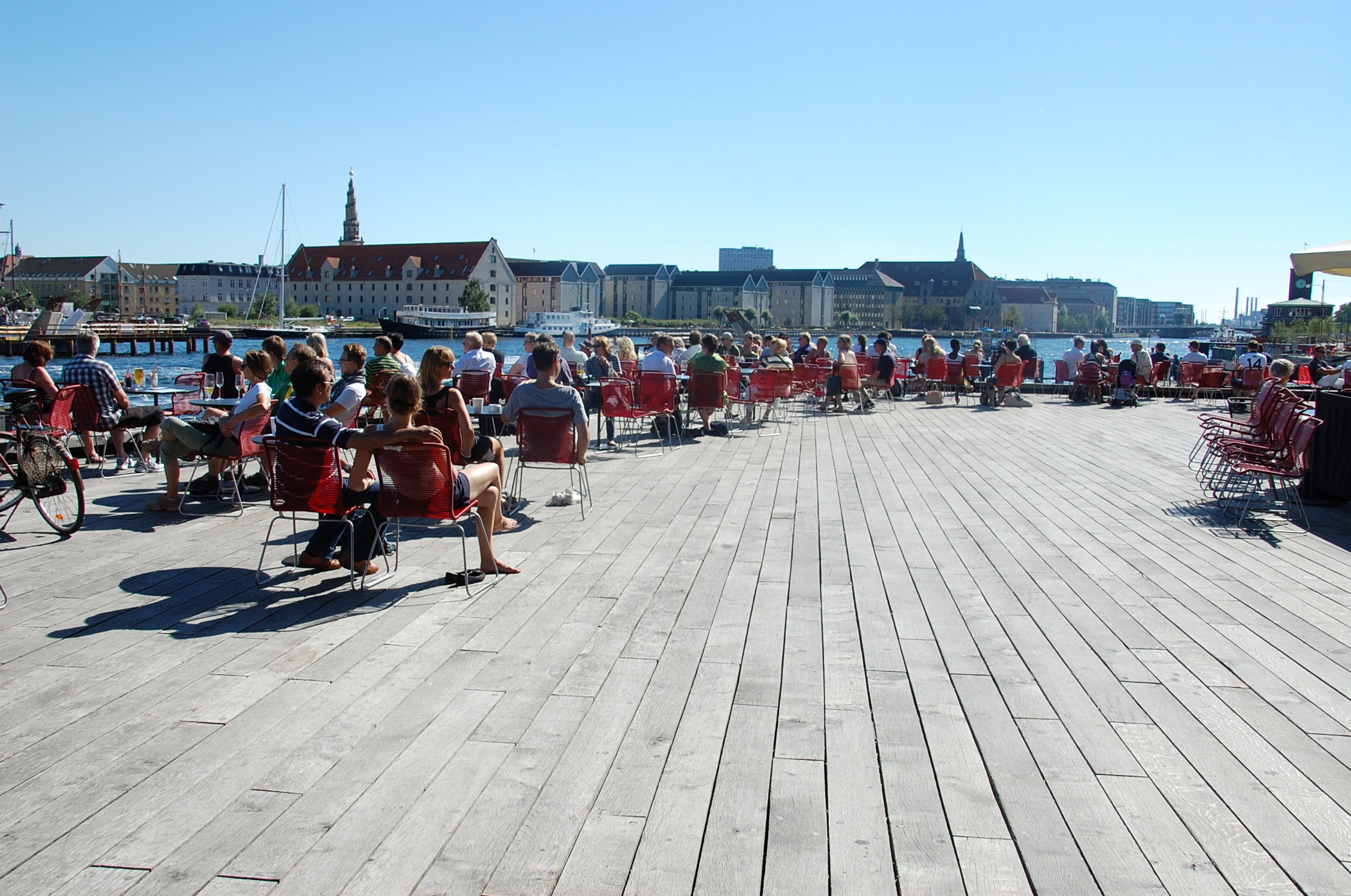 Was mich an Kopenhagen jedoch am meisten anspricht, ist sein entspanntes Betriebssystem – es ist eine Metropole auf der Slow Lane. Ich kenne keine andere Großstadt, deren Bewohner derart unangestrengt und zufrieden sind, überall wuseln Kinder herum, Kajaks gleiten die Kanäle entlang, an der Waterfront sonnen sich die Bewohner zwischen den Glaskuben. Entspannt kutschieren Väter! und Mütter ihre Kinder auf dem Christiana Bike – eine legendäre Rad-Marke – durch die Stadt, überhaupt wird hier die Familie groß geschrieben (Angestellte, die nach 18 Uhr arbeiten, werden vom Chef schel angesehen), selbst in den Sozialbauten sind gemütliche Holztische im Garten aufgestellt, an denen die Nachbarn beim Abendessen zusammen sitzen.