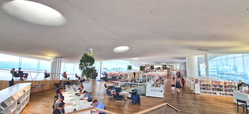 Ein Dritter Ort, wie er umsichtiger nicht gedacht sein könnte – divers, inklusiv und multifunktional: eine riesige lichtdurchflutete Bibliothek (in der man allerdings nicht ehrfürchtig schweigt, sondern angeregt aber dezent miteinander spricht, in der man lässig in bequemen Sitzmöbeln oder konzentriert an Arbeitstischen sitzt, in der es ein offenes Café ebenso gibt wie eine große Kinderspielzone, in der gekreischt, gelacht und gehüpft wird. Auf drei Etagen verteilen sich unterschiedliche  Räume, je nach Funktion offen oder abgeschlossen, aber immer transparent, durchlässig. Wissen, Bildung, Handwerk, Spiel und Begegnung. Hier machen Schüler ihre Hausaufgaben, dort lümmeln Teenager, in einer anderen Ecke sind Besucher:innen konzentriert über Bücher und Notebooks gebeugt. In einem anderen Stockwerk wird an einem der 3D-Drucker gewerkelt, daneben auf einer der Nähmaschinen ein Kleid fabriziert. Hausfrauen, Studentinnen, Gothic Girls – selbst ist der Mensch. Nachbarschaftsküche, Workshop-Räume, Maker Space, Kino und Studios, Räume für Bürgergruppen usf… Und eine großzügige Terrasse, auf der man hoch über der Stadt sitzt und dem kognitiven Kapitalismus entschwebt.
