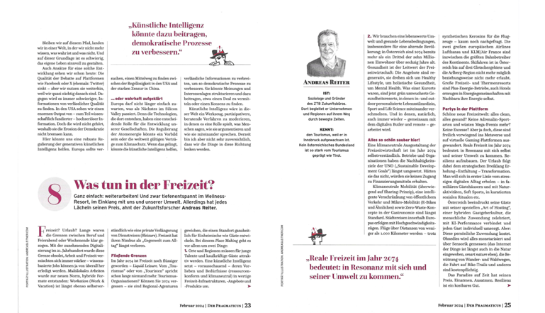 Wohin sich unsere Freizeit in Zukunft entwickelt und wie sich Gesundheit, Künstliche Intelligenz und Healthy Nature verschränken, bereiten wir immer wieder gerne in und für Medien auf, z.B. jüngst in der neuen Ausgabe von „Pragmaticus“ oder im Interview mit ServusTV: